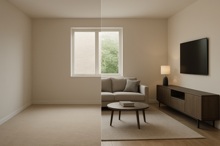 Il virtual staging trasforma fotografie reali di appartamenti vuoti in ambienti arredati e accoglienti. Grazie all’inserimento digitale di mobili e dettagli, un immobile datato o spoglio diventa subito più interessante agli occhi dei potenziali clienti.